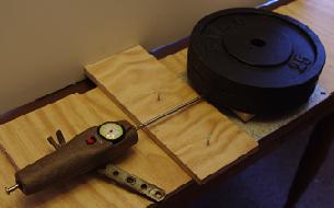 The horizontal pull slipmeter (HPS, dynamometer or tribometer, hand pulled as ASTM C-1028) that I have on hand is most similar to the ASTM standard (F-609) "Irvine" device. I use it because it is small and portable. It is mechanically simple. It measures both the static and dynamic "mu." "Mu" is easily computed from the ratio of the two forces actually measured by the slipmeter, plugging the values into the µ=force[parallel]/force[normal] formula (HPC). My slipmeter has three round feet with replaceable pads for using the standard leather material or other selections (ASTM F-609). Testing is done dry, as this is the standard method. Wet measurements are possible, but unreliable (and useless). The Measurement Instruments version uses a separate weight rather than one affixed under the force meter as in a true Irvine device.